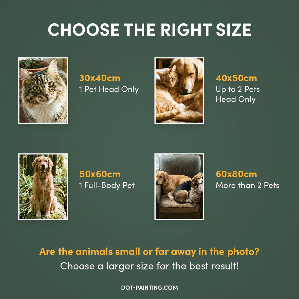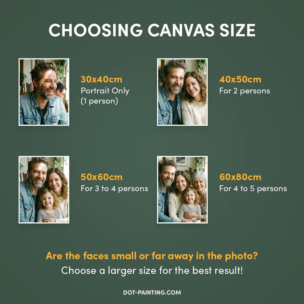 Le dimensioni contano Mentre la dimensione più piccola 8x12" è carina per immagini semplici, consigliamo vivamente di scegliere una dimensione di almeno 12x16" o 16x20" per il miglior risultato. La regola generale nel dot painting è semplice: più grande è la tela, più dettagli possiamo catturare e più sbalorditivo sarà il tuo capolavoro finale.