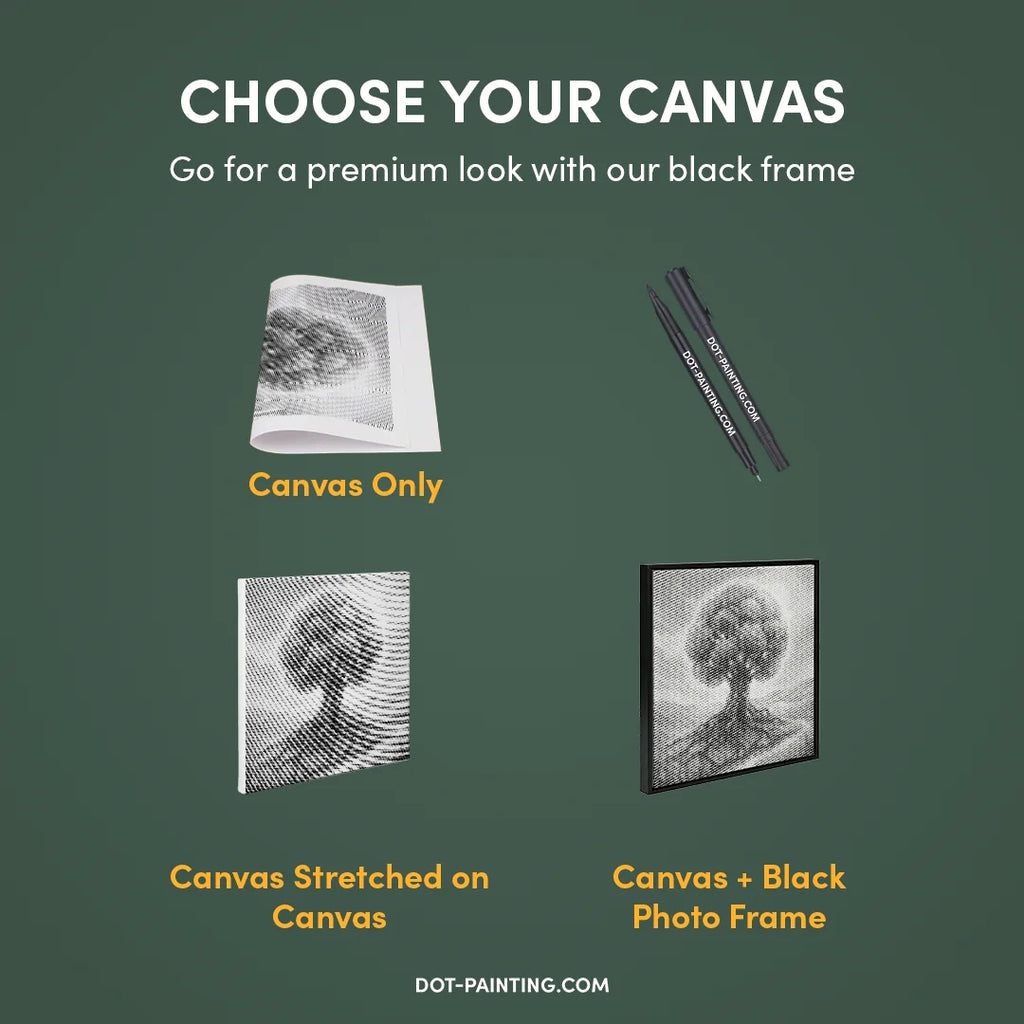• 1x Tela Premium (arrotolata): Tela di alta qualità con il design che hai scelto. La spediamo arrotolata in un tubo rigido, mai piegata, così inizi su una superficie liscia e senza pieghe.