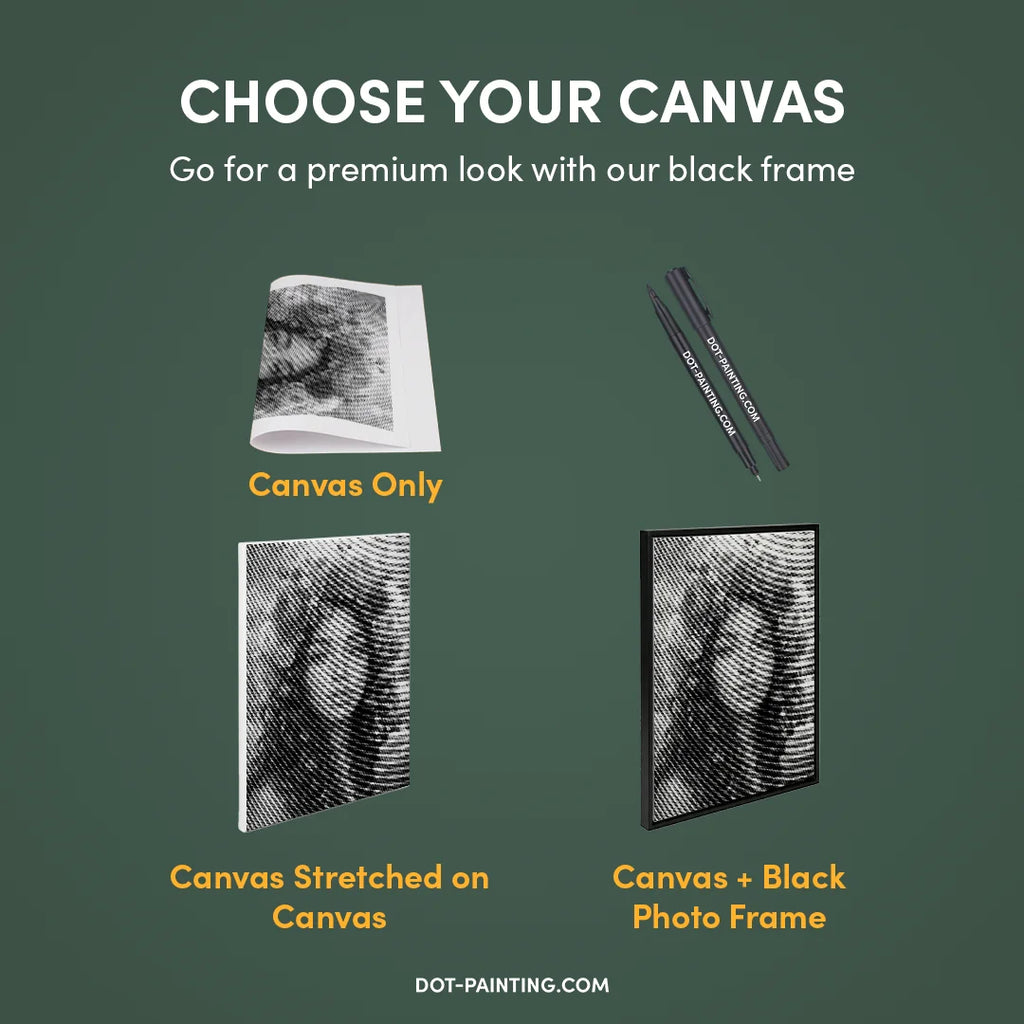 • 1x Tela Premium (arrotolata): Tela di alta qualità con il design che hai scelto. La spediamo arrotolata in un tubo rigido, mai piegata, così inizi su una superficie liscia e senza pieghe.