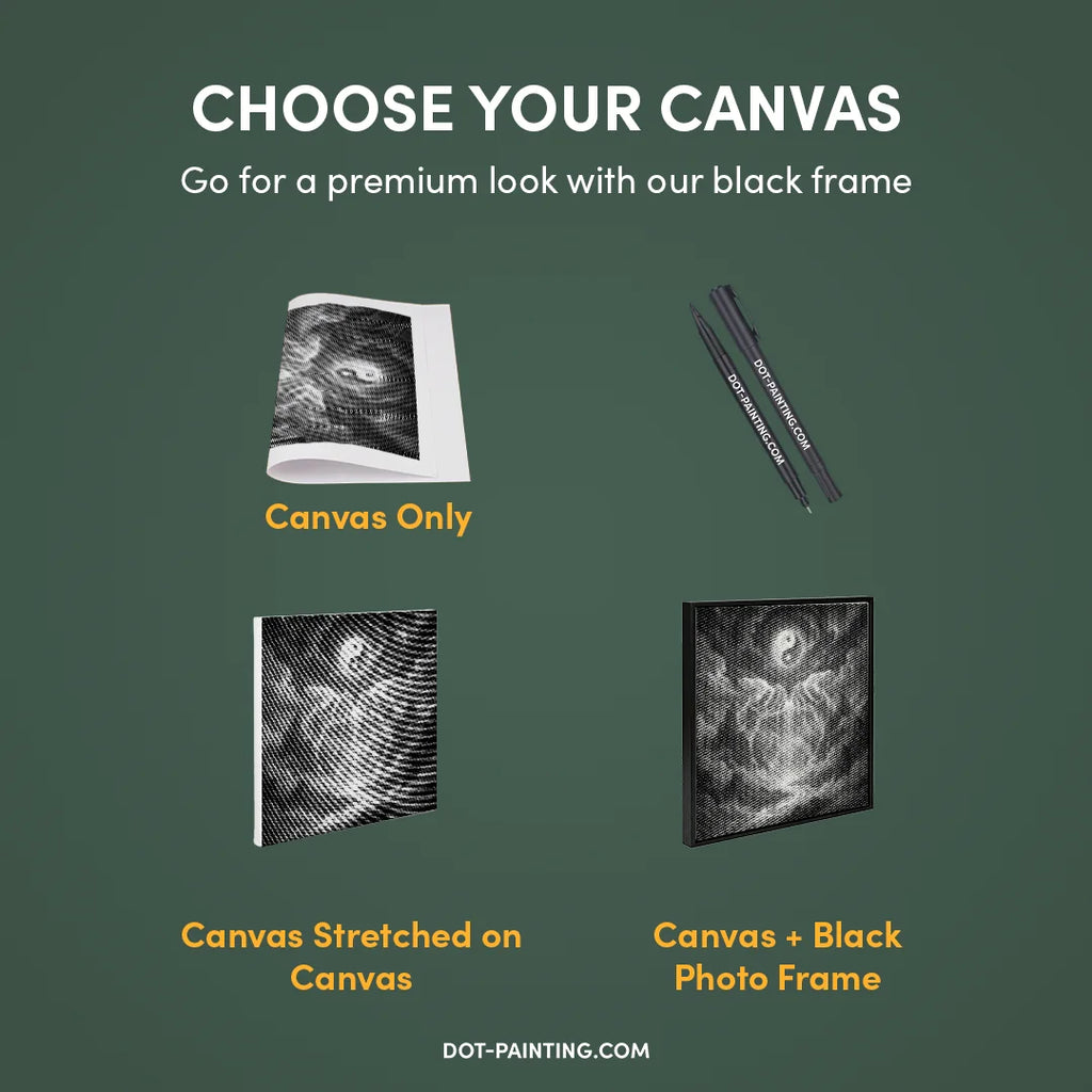 • 1x Tela Premium (arrotolata): Tela di alta qualità con il design che hai scelto. La spediamo arrotolata in un tubo rigido, mai piegata, così inizi su una superficie liscia e senza pieghe.