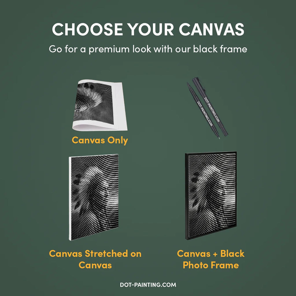 • 1x Tela Premium (arrotolata): Tela di alta qualità con il design che hai scelto. La spediamo arrotolata in un tubo rigido, mai piegata, così inizi su una superficie liscia e senza pieghe.