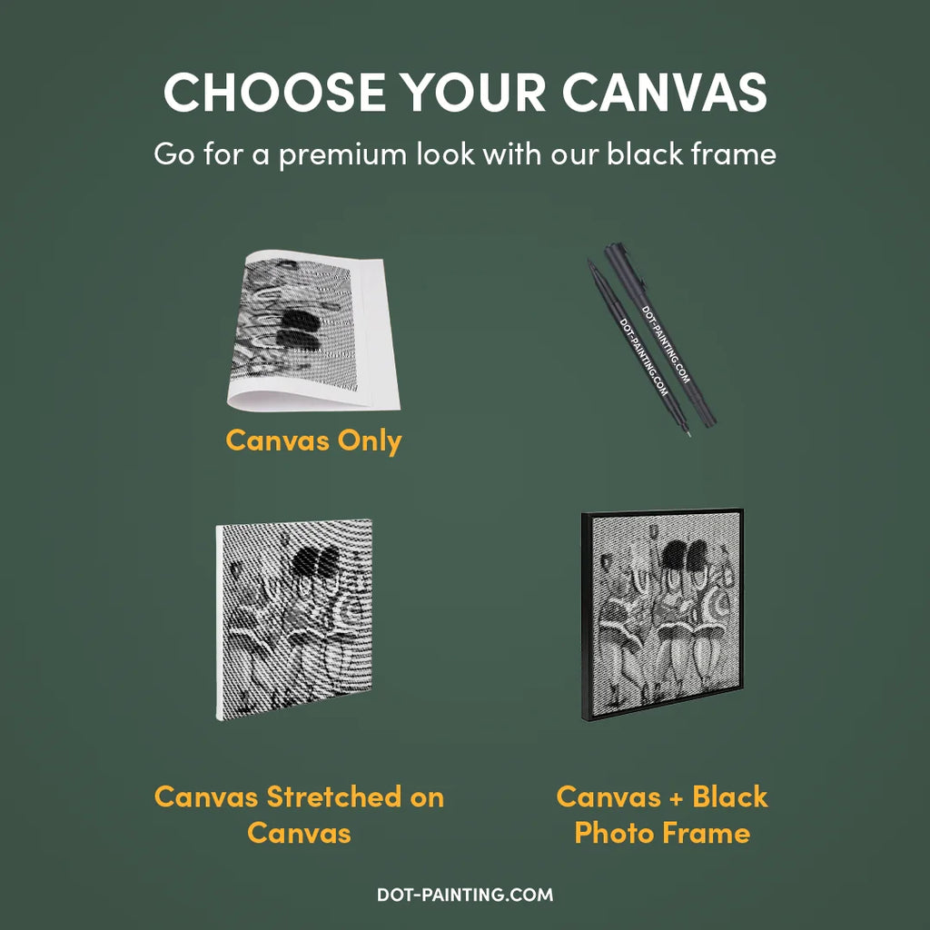 • 1x Tela Premium (arrotolata): Tela di alta qualità con il design che hai scelto. La spediamo arrotolata in un tubo rigido, mai piegata, così inizi su una superficie liscia e senza pieghe.