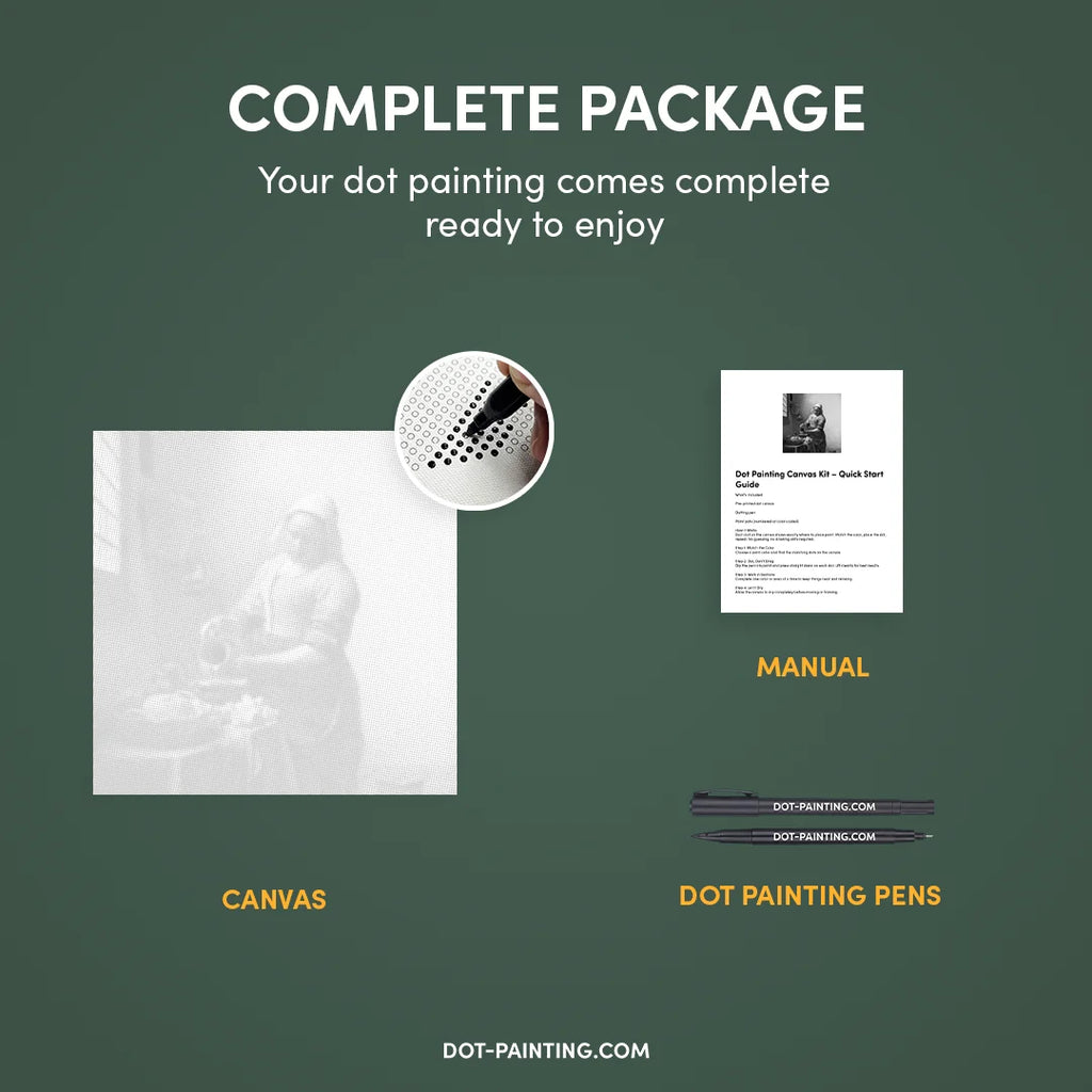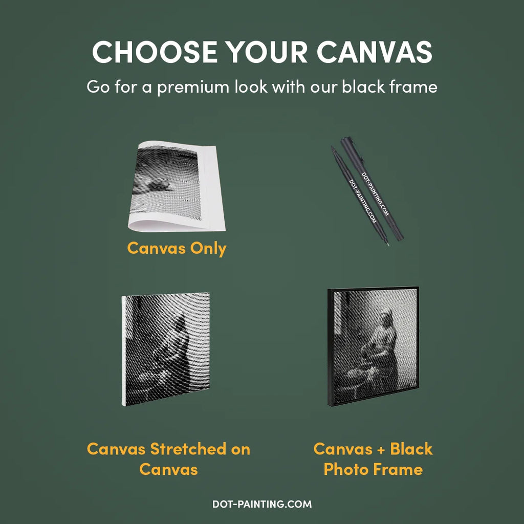 • 1x Tela Premium (arrotolata): Tela di alta qualità con il design che hai scelto. La spediamo arrotolata in un tubo rigido, mai piegata, così inizi su una superficie liscia e senza pieghe.