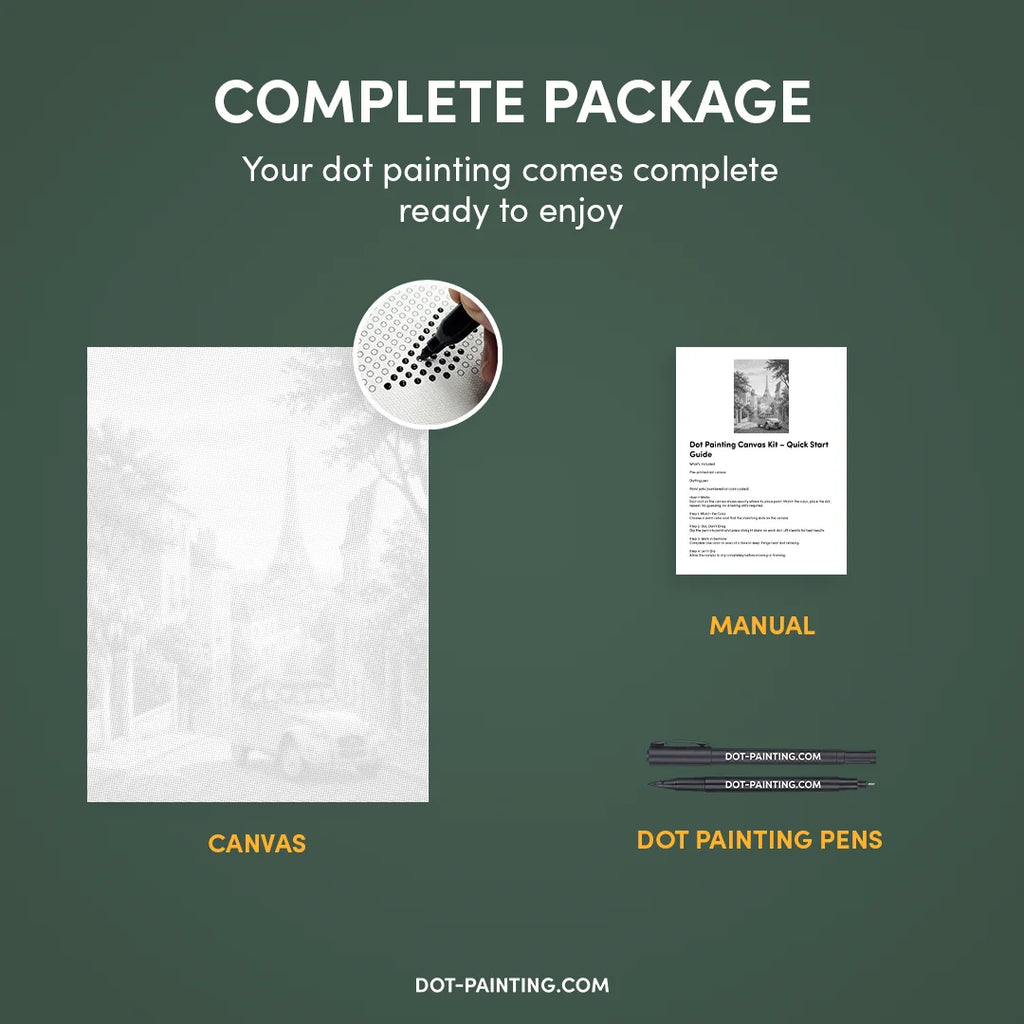 • 1x Tela Premium (arrotolata): Tela di alta qualità con il design che hai scelto. La spediamo arrotolata in un tubo rigido, mai piegata, così inizi su una superficie liscia e senza pieghe.